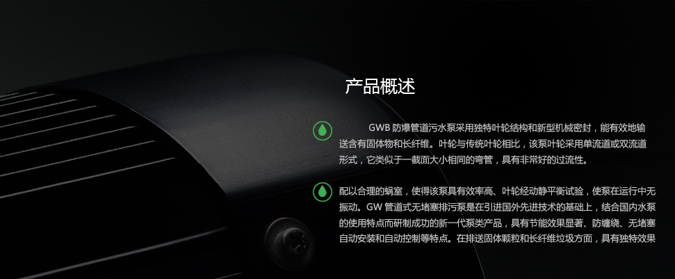 GWB防爆電機(jī)管道泵是在引進(jìn)國外先進(jìn)技術(shù)的基礎(chǔ)上,結(jié)合國內(nèi)水泵的使用特點(diǎn)而研制成功的新一代泵類產(chǎn)品,具有節(jié)能效果顯著、防纏繞、無堵塞、自動安裝和自動控制等特點(diǎn)。在排送固體顆粒和長纖維垃圾方面,具有獨(dú)特效果。