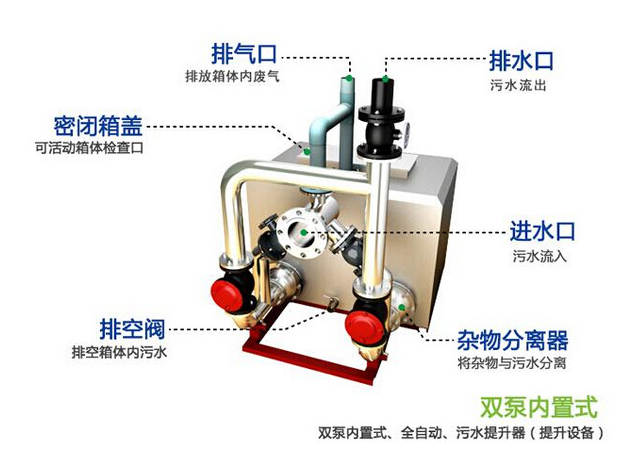 4、分體式雜物分離裝置:分體式雜物分離實現(xiàn)了雜物和污水的分離,雜物通過進(jìn)水管路進(jìn)入雜物分離裝置,并暫存在雜物分離器中,污水正常流入密閉式箱體,雜物不接觸排污 泵葉輪,排污泵工作排水時,通過排水管路,利用排污泵的排水水壓,帶走雜物分離器中暫存的雜物,提升排放到市政管網(wǎng)。徹底杜絕了用絞刀泵解決堵塞,但會纏繞泵、卡 泵的停機(jī)情況發(fā)生;
