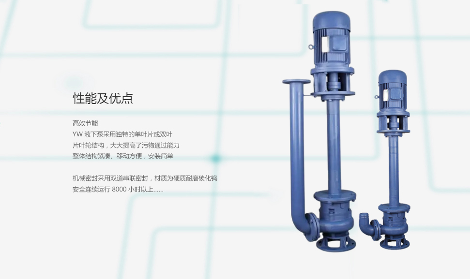3、 YW液下泵 采用獨特的單葉片或雙葉片葉輪結構,大大提高了污物通過能力,能有效的通過泵口徑的5倍纖維物質與直徑為泵口徑約為50%的固體顆粒。